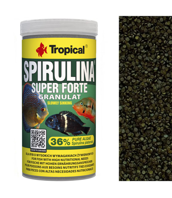 Tropical Spirulina Super Forte Gran, içeriğinin %36’sını oluşturan saf Spirulina yosunu ile otçul ve omnivor akvaryum balıkları için özel olarak geliştirilmiş yüksek kaliteli bir granül yemdir. Doğal bitkisel içeriği sayesinde sindirimi kolaylaştırır, bağışıklık sistemini destekler ve balıkların daha sağlıklı, canlı ve dengeli gelişmesine katkı sağlar.