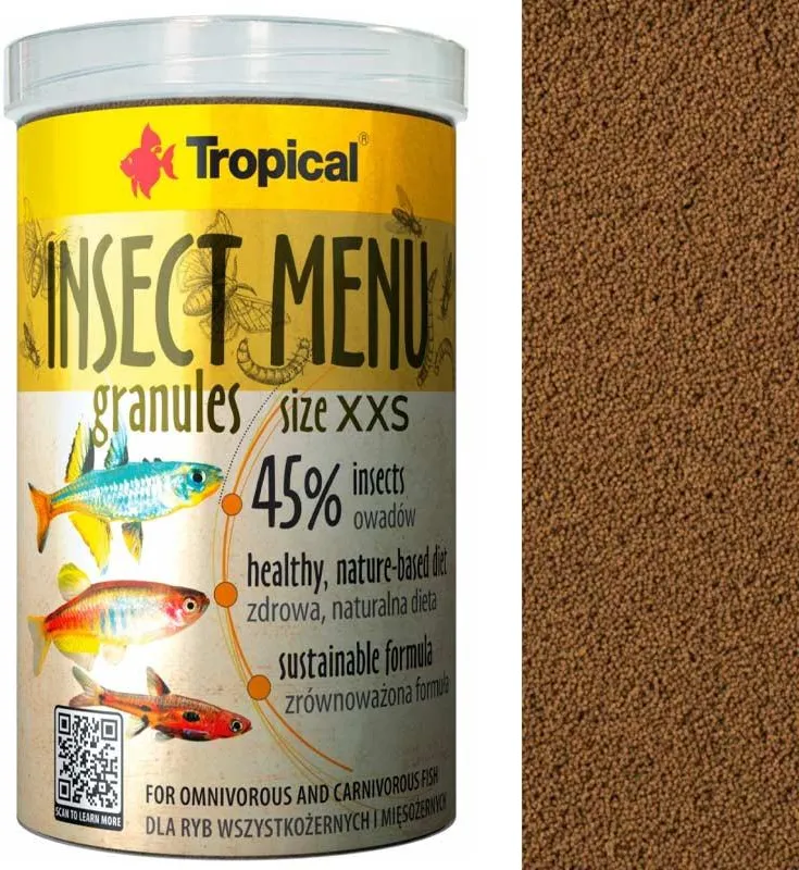 Tropical Insect Menu XXS Granulat, %45 protein oranına sahip un kurdu, ipek böceği ve hermetia (asker sineği larvası) içeren mikro boy granül yemdir. Yavru ve küçük balıklar için mükemmel doğal protein kaynağıdır.