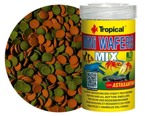 Tropical Mini Wafers Mix 100ml (55gr), dip canlıları için özel olarak hazırlanmış batıcı (sinking) yem karışımıdır.