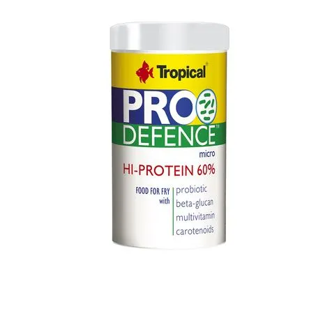 Tropical Pro Defence Micro Hi-Protein %60, Betta Didyma Pet güvencesiyle sunulan, yavru ve yeni çıkmış balıklar için özel olarak geliştirilmiş yüksek proteinli (%60) probiyotik destekli toz yemdir.