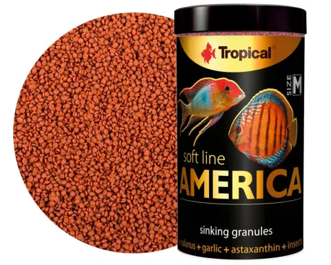 Tropical Soft Line America M 100ml (60gr), Betta Didyma Pet güvencesiyle sunulan, yüksek besin değerli, yumuşak yapıdaki premium granül yem serisinin Amerika formülüdür.